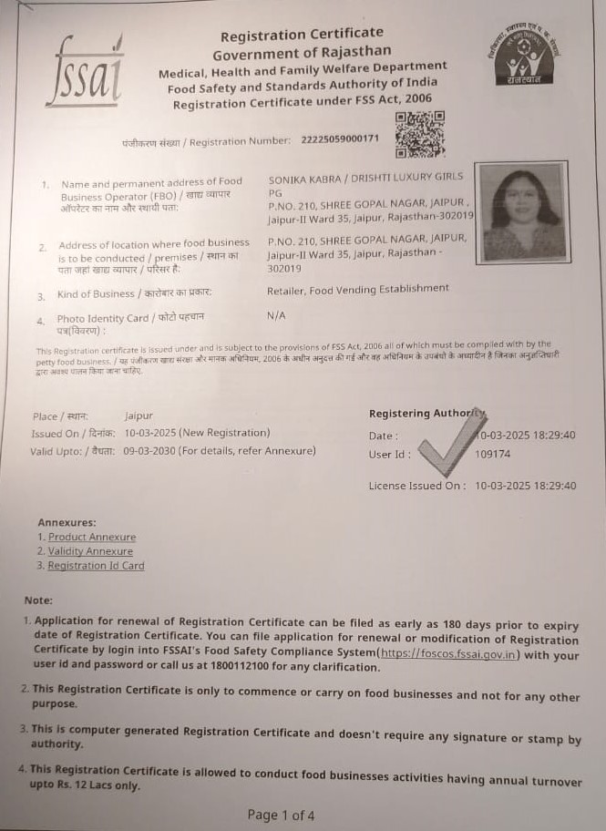 Since 2021, Drishti Luxury Hostels under the leadership of Sonia Kabra have become a trusted name in Jaipur for girlsβ accommodation. With three hostels running successfully in Pratap Nagar, Mahesh Nagar, and Shanti Nagar, she continues to expand her mission of providing safe, affordable, and homely living spaces for students and working women.